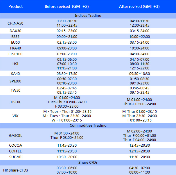 If you use an Expert Advisor (EA) / automated trading robot which requires the GMT offset to be manually entered, please ensure that you adjust the GMT offset to GMT+3Hrs to reflect this change before market open on the next Monday.