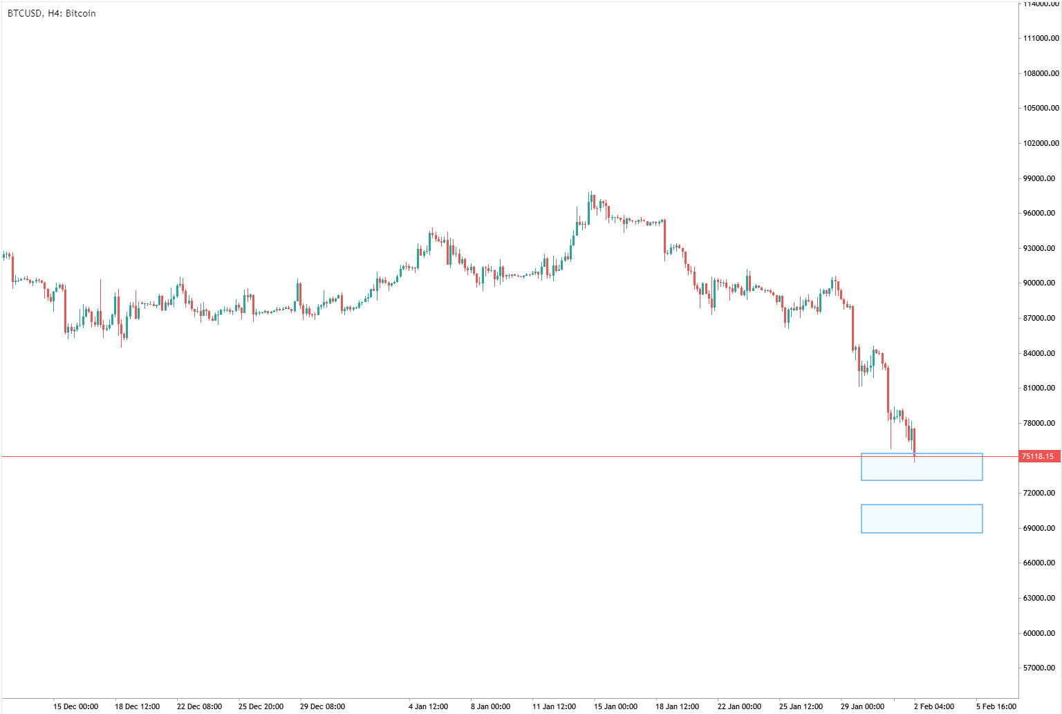 - يواصل سعر البيتكوين اتجاهه الهبوطي نحو مستوى الدعم عند 75,000 دولار.