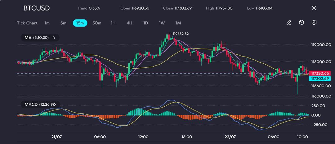 Bitcoin’s ascent has tapered off slightly, with the asset now hovering near $117,300 following a local high of $119,652. While the short-term chart shows a modest pullback, this decline comes on the heels of a strong rally and likely signals consolidation rather than a full reversal.