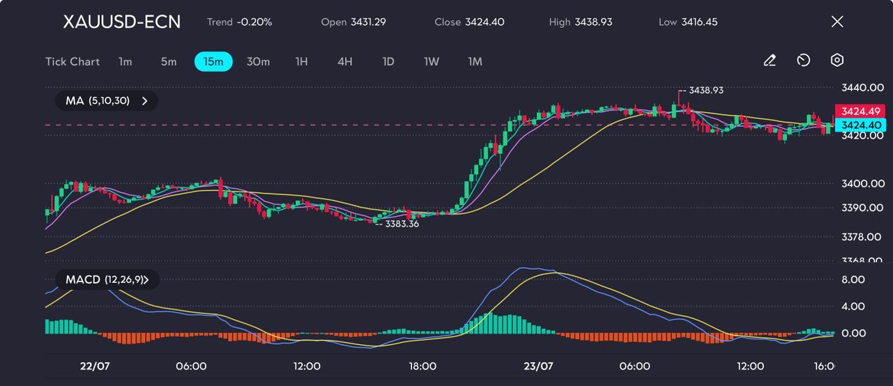 The 15-minute moving averages are now flattened and converging—pointing to a consolidation phase. Traders should watch for a clean breakout above $3440 or a breakdown below $3416 for fresh directional cues, especially as markets digest recent geopolitical headlines and US macro prints.