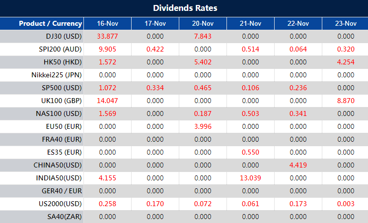 Please note that the dividends of the following products will be adjusted accordingly. Index dividends will be executed separately through a balance statement directly to your trading account, and the comment will be in the following format “Div & Product Name & Net Volume ”.