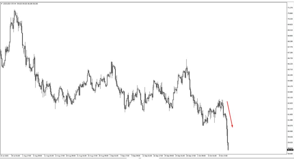 Oil extended losses below 60.55, testing 58.35 support. If consolidation fails above 58.00, the price could slide toward 53.00. Short-term rebounds face resistance at 59.80–60.50; bias stays bearish below 60.55.