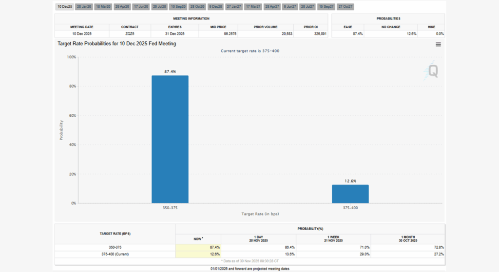 FedWatch probabilities have moved sharply over the past two weeks. Futures now reflect an 87% likelihood of a 25 bp cut at the 10 December FOMC meeting, compared with roughly 40–50% just days earlier.