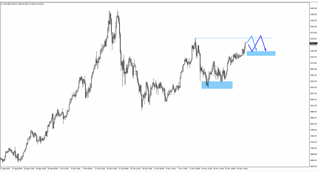 Gold remained above the 4,190 monitored area, supported by lower yields and rising expectations of a December cut.