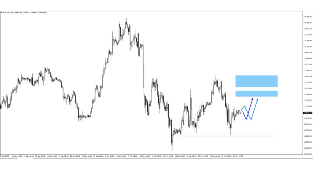 Holding above 106,000; could target 112,800–114,650 if sentiment stabilizes.