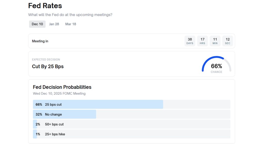 - Polymarket: 66% probability of a cut, 32% chance of no change