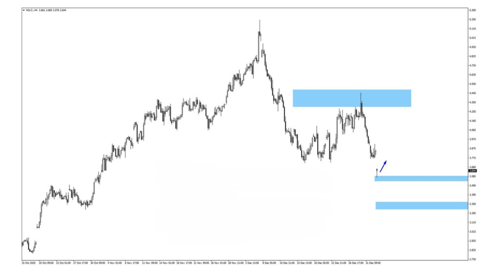 Natural gas consolidated briefly before gapping lower on Monday, sliding into the 3.57 monitored demand zone. If price consolidates below the recent structure, watch for bearish reactions near 3.86. Continued downside momentum would shift focus toward the 3.22 support area.