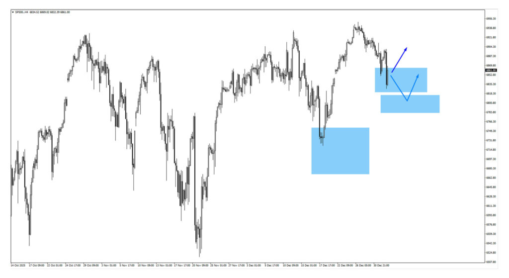 The S&P 500 is trading around the 6,840 monitored area, making this a key near-term inflection zone. If price pulls back, bullish reactions may emerge near 6,795.