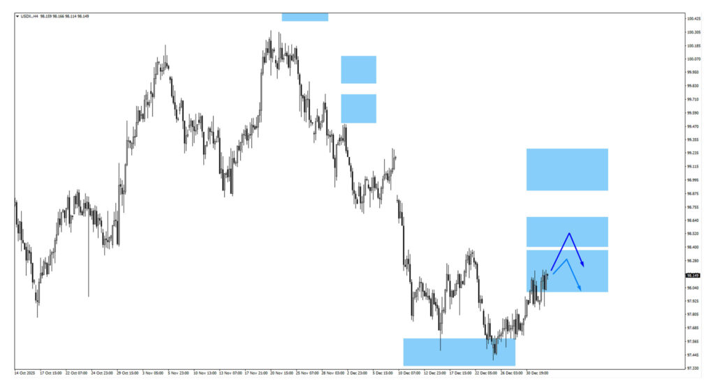 USDX is trading near the 98.20 area, approaching a key reaction zone. Failure to sustain above this level could invite bearish price action and a move back toward 98.55, now acting as a rejection zone. Geopolitical developments may add short-term volatility.