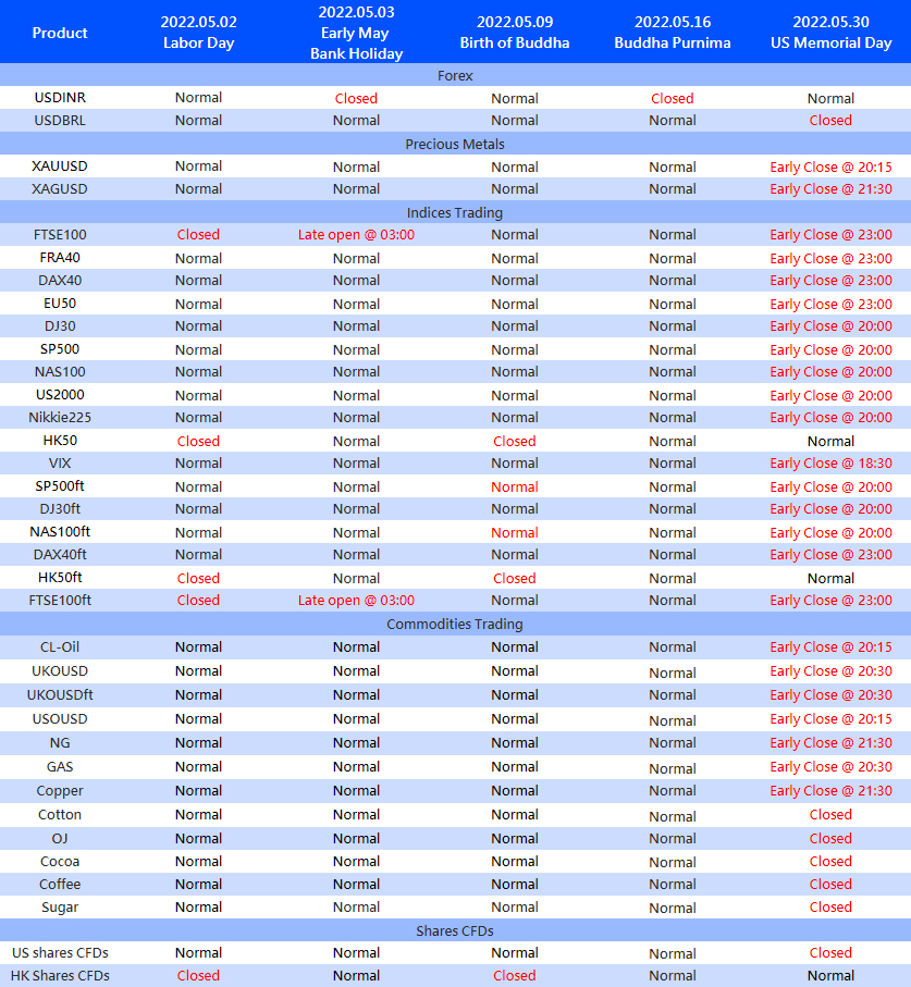 Please note the adjustment on the following products due to the international holiday in May: