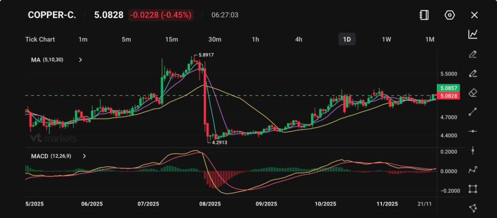 Copper prices have stabilised after the sharp August crash from the 5.89 peak to the 4.29 low, with the current price hovering around 5.08.
