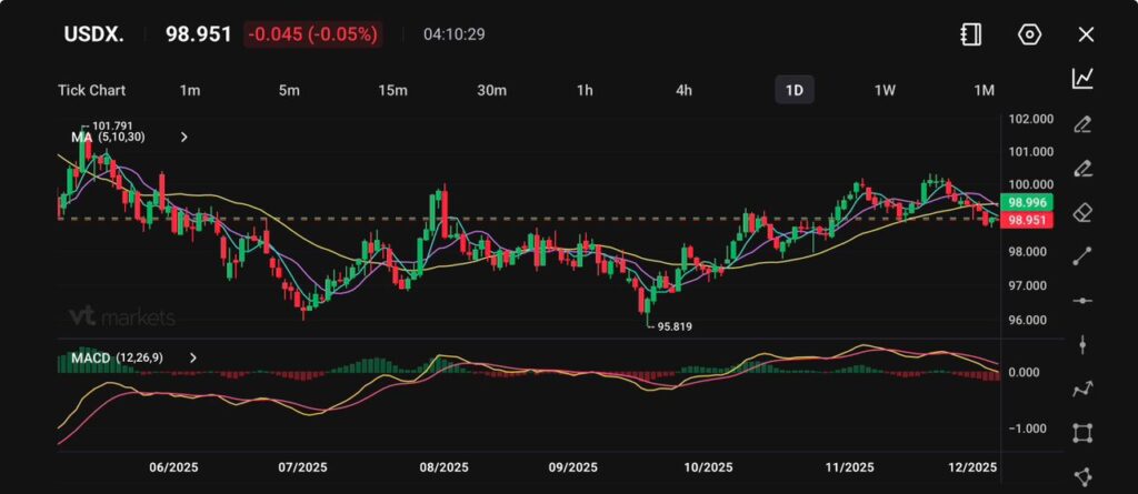 The US Dollar Index has edged lower to 98.951, continuing its mild retreat after failing to break above the 100.80 resistance in mid-November.