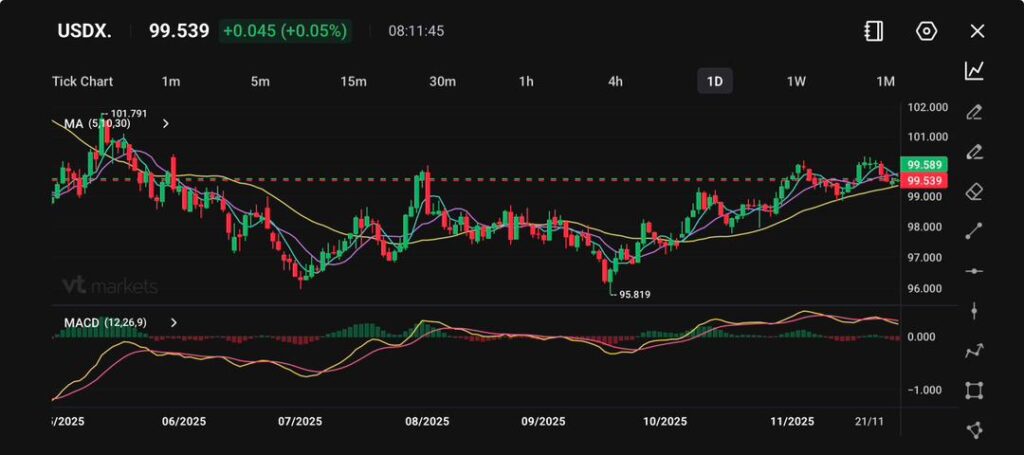 The US Dollar Index (USDX) is consolidating just beneath the 100 level, holding a modest uptrend after rebounding from the 95.81 low in September.