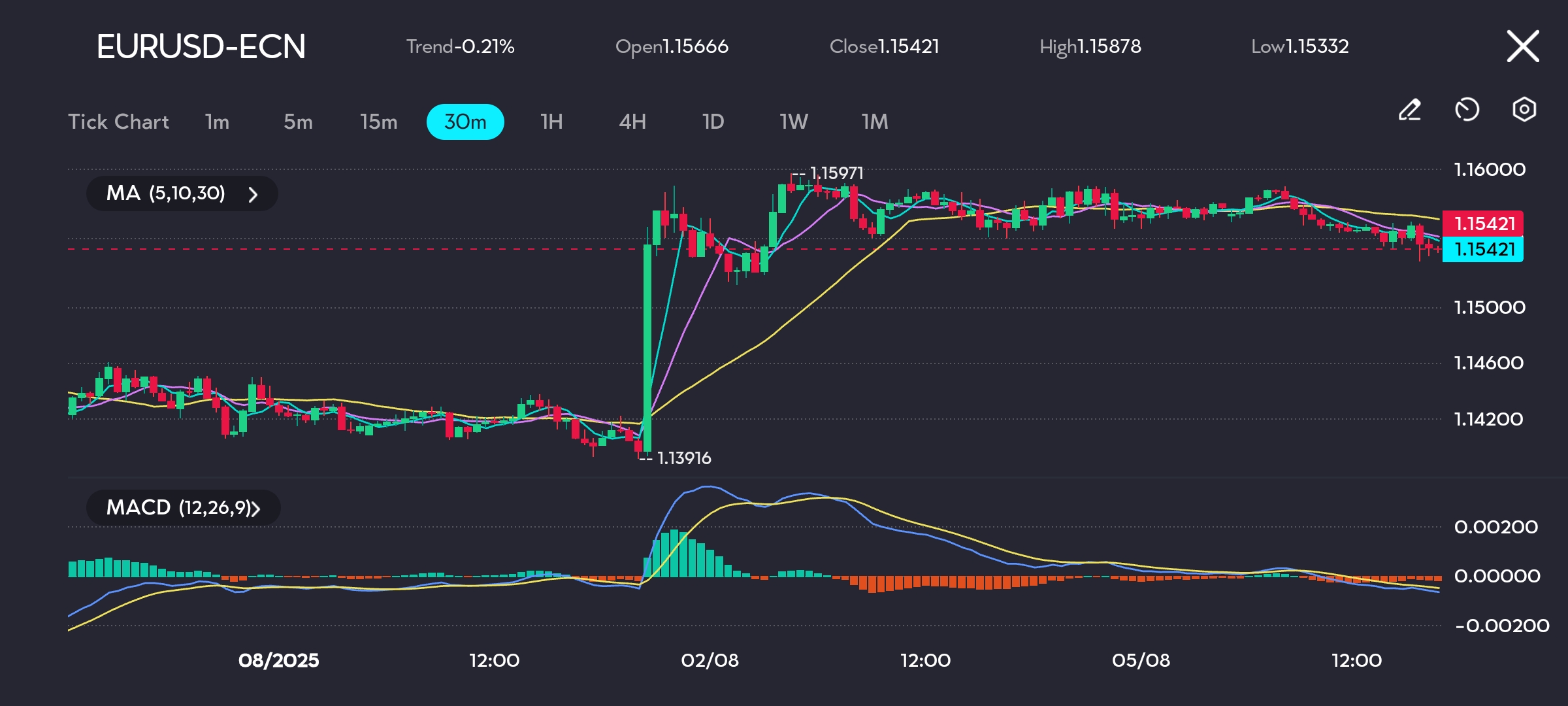 On a technical front, the immediate trend for EURUSD is showing a slight downturn of -0.21%. After a strong rally that peaked at 1.15971, the price has been trading in a sideways range, indicating indecision in the market.