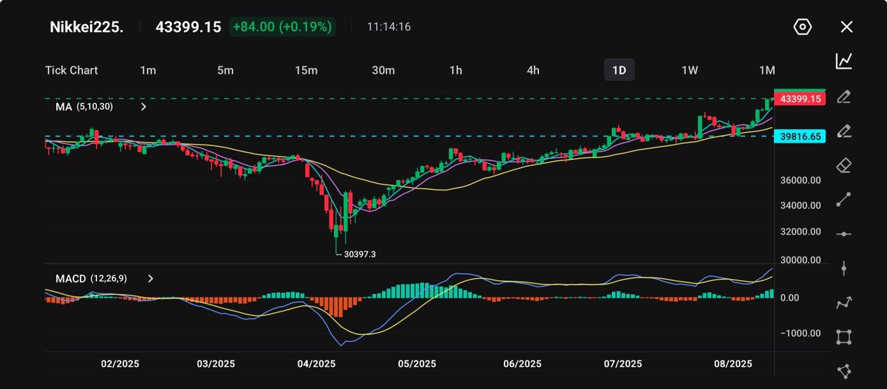 The Nikkei 225 has seen a strong recovery since its April low of 30,397, climbing steadily to its current level of 43,399. The price has broken above previous resistance levels, with the short-term moving averages trending firmly upward and well above the longer-term MA, indicating sustained bullish momentum.