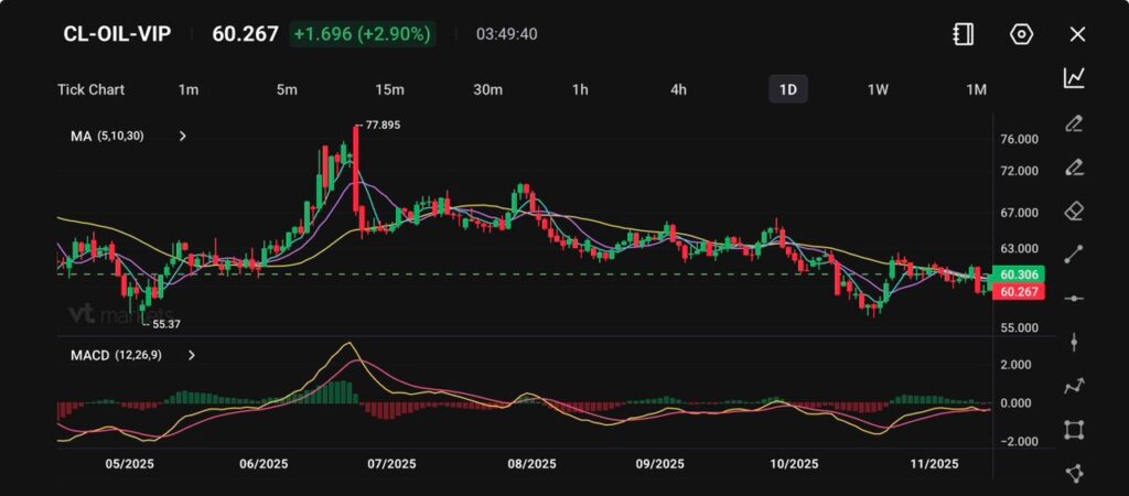 Crude oil prices have rebounded to around $60.27, climbing nearly 2.9% after testing support near the $55 zone earlier this month.