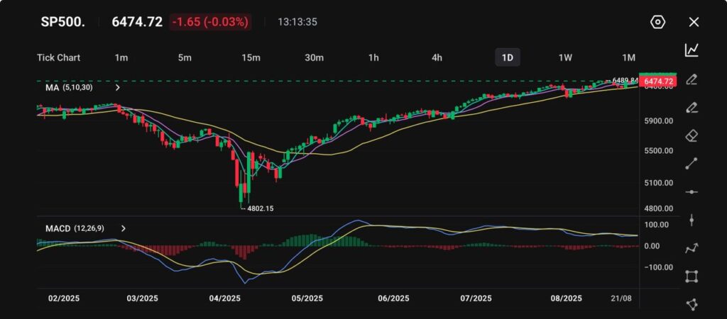 The S&P 500 (SPX) has extended its recovery strongly from April’s low of 4,802, reaching a fresh high near 6,480 before easing slightly to 6,474.
