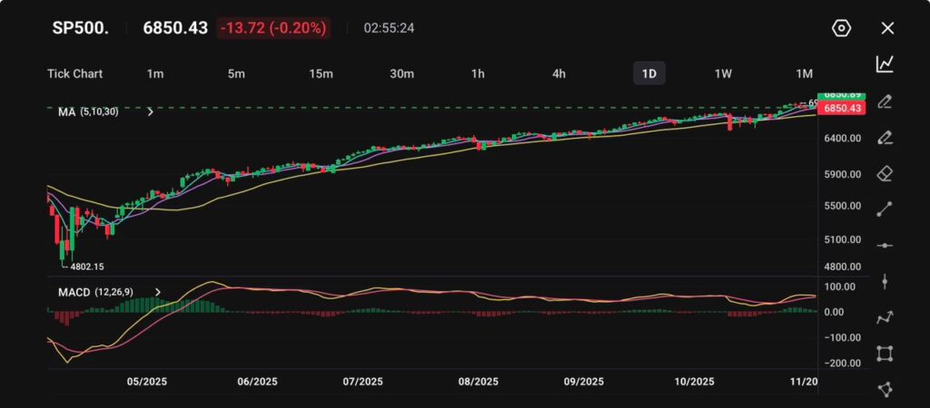 The S&P 500 slipped 0.20% to 6,850, pausing after October’s strong rally as traders digested fresh signals from the Federal Reserve and renewed U.S.–China dialogue.