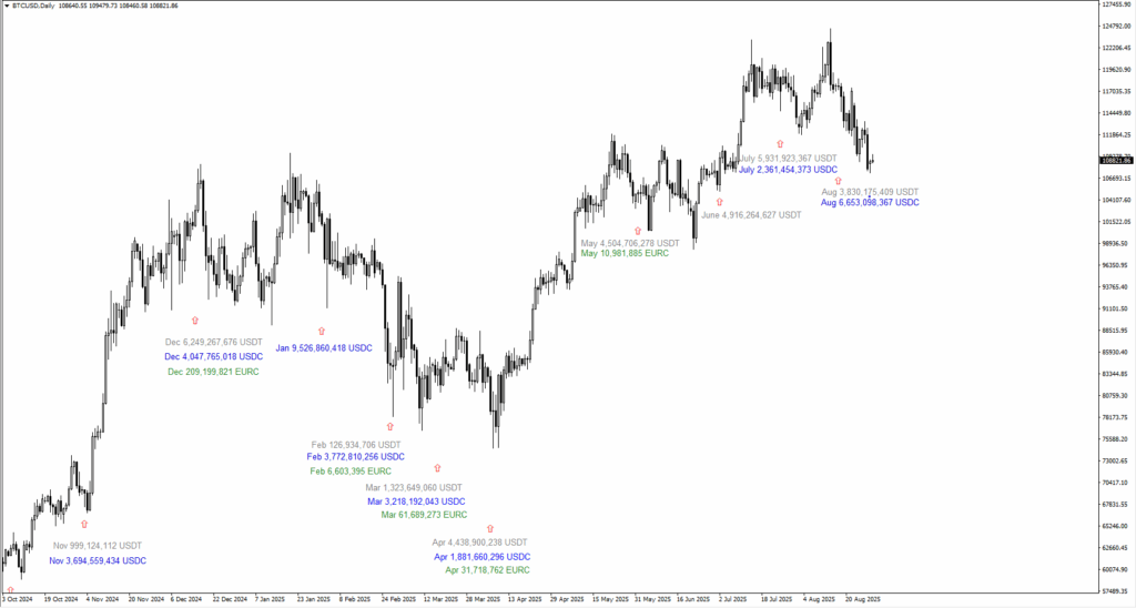 The liquidity backdrop is still powerful. From November 2024 through August 2025, more than 67 billion dollars in fresh stablecoins have entered circulation across USDT, USDC, and EURC.