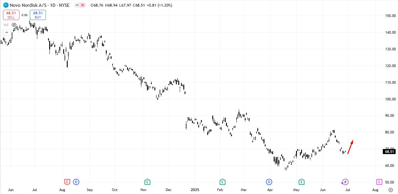 Novo Nordisk (NVO) is trading around 67.80. Like UNH, its market value remains far below its estimated intrinsic value of $150, and long-term investors may look to accumulate gradually at these levels.
