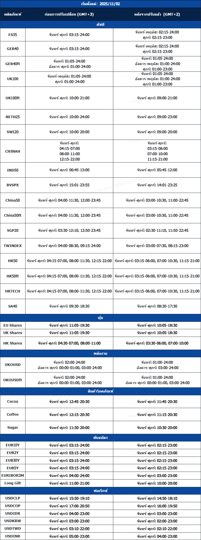 เวลาทำการของผลิตภัณฑ์บางรายการบน MT4/MT5 จะมีการเปลี่ยนแปลง เนื่องจาก สหรัฐอเมริกากำลังเปลี่ยนจากเวลาออมแสง (Daylight Saving Time) เป็นเวลาเก่า (Standard Time)