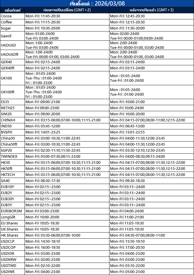 เวลาทำการของผลิตภัณฑ์บางรายการบน MT4/MT5 จะมีการเปลี่ยนแปลง